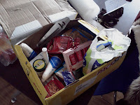 Inhalt u.a. Schokolade, Marzipan, Spekulatius, Handcreme, Bodylotion, Lippencreme, Zuckerhüte für Feuerzangbowle inkl. Zange, Tee, ein paar Medikamente, Winterstiefel etc.
