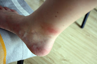 Und nicht nur, dass sie riesig sind, nein, ich scheine darauf wirklich allergisch zu reagieren, denn sie jucken nicht (nur), sondern tun vor allem weh. Vor allem der am Fuß ist so schlimm, dass ich nicht mehr richtig laufen kann, weil mein ganzer Fuß ein einziger Schmerz ist!