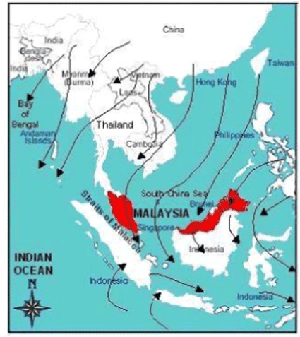 Auf der Karte kann man sehen, dass alles, das von Süden kommt, zum großen Teil erst von Indonesien abgefangen wird. Trotzdem ist der Regen im Westen Malaysias, also Kuala Lumpur Seite, spürbar. Es regnet dort weitaus mehr. Malaysia hat allerdings direkt hinter KL ein Gebirge, wo viele Wolken abgefangen werden und es abregnet. Dieses Gebirge ist der Grund, warum ich so ungern mit dem Auto nach KL fahre… Echt furchtbar die Strecke. Während es also im Sommer an der Westküste Malaysias regnet, bleibt es an der Ostküste, auf Borneo und auch Indonesien größtenteils trocken. Ab September/ Oktober drehen sich die Winde, der Nordost Monsun kommt.