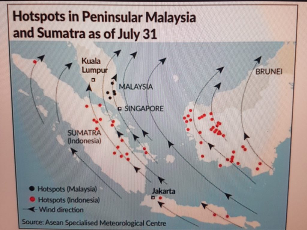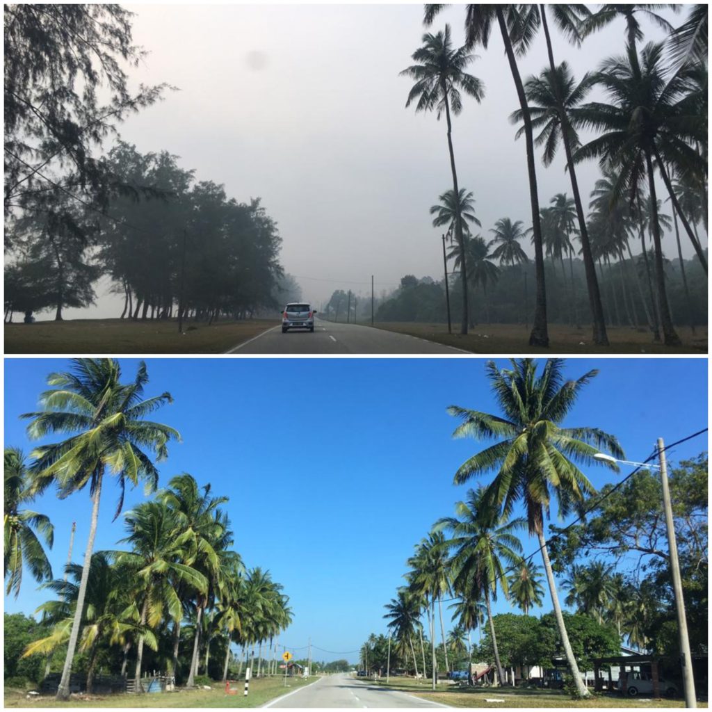 Als ich in von Mitte Juni bis Mitte August in Pekan unterrichtete, fing es schon an, dass der Campus morgens in einem dichten Nebel gefangen war. Dass dies kein feuchter Nebel ist, weiß man, wenn man mal tief einatmet. Rauch. Eine Mischung aus frischem Grill und geschmortem Plastik. Dies war der Beginn der Trockenzeit in Indonesien, wo man den ausbleibenden Regen nutzt, um Felder und Wälder für neue Palmplantagen abzubrennen. Mehr zum Thema Palmöl hier. Zu der Zeit ist es auch in Malaysia recht trocken, wohingegen es von Indien bis Thailand heftig regnet (deshalb fahren ja auch alle um Weihnachten nach Thailand, während man in Malaysia und Indonesien eher Vorräte aufstockt, falls man mal das Haus nicht mehr verlassen kann). Die Monsunwinde drücken in den Sommermonaten den Rauch aus Indonesien hoch nach Singapur und Malaysia, dann knickt er Richtung Ostchinesisches Meer ab. Aber wie jedes Schulkind eigentlich weiß: Wenn es nicht regnet, spielt man nicht mit Feuer. So kommt es JEDES JAHR zu unkontrollierten, offenen Bränden. So sah es Ende Juli aus:
