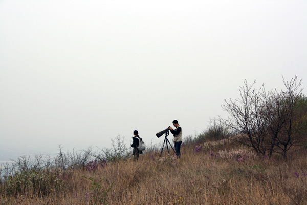 Tja… und dann war ich gestern von 8 Uhr morgens bis 19 Uhr abends mit Ornitologen im Nanjinger Umland unterwegs. Eine bequemere Variante aufs Land zu kommen gibt es eigentlich nicht, denn die Vogelfreunde sind schon alles arbeitende Menschen und besitzen dicke Autos 😉 Leider spielte das Wetter auch nur bedingt mit, denn es war sehr windig und kühl, zudem (wie beinahe immer) nebelig. Trotzdem gab es viel zu entdecken, vor allem, wenn man so krasse Ausrüstung dabei hat, wie dieser Mann auf dem Foto links. Mit ein wenig Bestechung durften wir auch mit dem Auto auf den Gipfel fahren, während alle anderen Besucher laufen mussten.