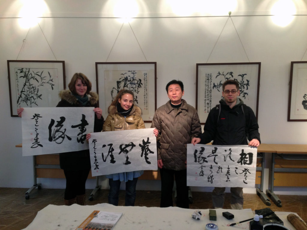 So, dann war ich diese Woche bei einer Kalligrafieausstellung, wo uns der Künstler persönlich vieles über seine Werke erzählt hat. Nicht, das ich was verstanden hätte, außer “Das ist der Mao-Stil” oder “Das ist der Xu-Stil”, aber egal. Er hat mir am Ende eine eigene Kalligrafie geschrieben, daher bin ich jetzt in Besitz eines Originals, das zuhause eingerahmt werden kann. Ich hoffe ja, dass es den Transport überlebt!